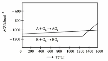 A reduces $\mathrm{BO}_{2}$ when temperature is above $1400^{\circ} \mathrm{C}$ because above $1400^{\circ} \mathrm{C}$ A has more ve $\Delta \mathrm{G}^{\circ}$ for $\mathrm{AO}_{2}$ formation than $\mathrm{B}$ to $\mathrm{BO}_{2}$ formation.