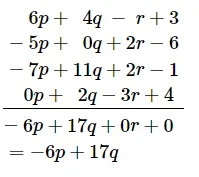 6p + 4q − r + 3, 2r − 5p − 6, 11q − 7p + 2r − 1 and 2q − 3r + 4