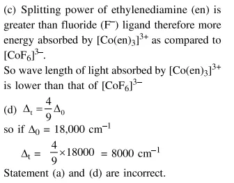 (c) Wavelength of light absorbed by $\left[\mathrm{Co}(\mathrm{en})_{3}\right]^{3+}$ is lower than that of $\left[\mathrm{CoF}_{6}\right]^{3-}$