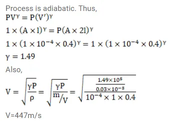 An adiabatic cylindrical tube of cross-sectional area $1 \mathrm{~cm}^{3}$ is closed at one end and fitted with a piston at the other end. The tube contains $0.03 \mathrm{~g}$ of an ideal gas. At 1 atm pressure and at the temperature of the surrounding, the length of the gas column is $40 \mathrm{~cm}$. The piston is suddenly pulled out to double the length of the column. The pressure of the gas falls to $0.355 \mathrm{~atm}$. Find the speed of sound in the gas at atmospheric temperature.
