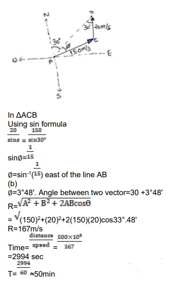 An aero plane has to go from point $A$ to another point $B, 500 \mathrm{~km}$ away due to $30^{\circ}$ east of north. A wind is blowing due north at a seed of $20 \mathrm{~m} / \mathrm{s}$. The air speed of the plane is $150 \mathrm{~m} / \mathrm{s}$.