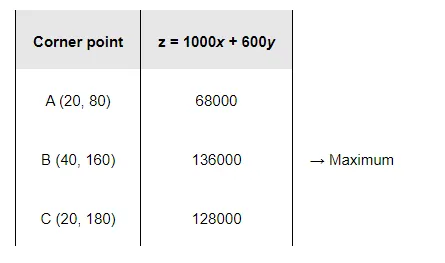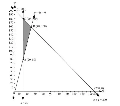 The corner points of the feasible region are A (20, 80), B (40, 160), and C (20, 180).