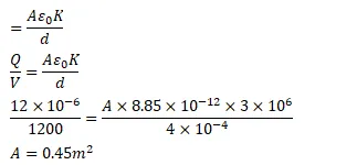 An air filled parallel-plate capacitor is to be constructed which can store $12 \mu \mathrm{C}$ of charge when operated at $1200 \mathrm{~V}$. What can be the minimum plate area of the capacitor? The dielectric strength of air $3 \times 10^{6} \mathrm{~V} / \mathrm{m}$.