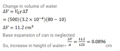 An aluminium can of cylindrical shape contains $500 \mathrm{~cm}^{3}$ of water. The area of inner cross-section of the can is $125^{\mathrm{cm}^{2}}$. All measurements refer to $10^{\circ} \mathrm{C}$. Find the rise in the water level if the temperature increases to $80^{\circ} \mathrm{C}$. The coefficient of linear expansion of aluminium $=23^{\times 10^{-6} /{ }^{\circ} \mathrm{C}}$ and the average coefficient of volume expansion of water $=3.2^{\times 10^{-4}} /{ }^{\circ} \mathrm{C}$ respectively.