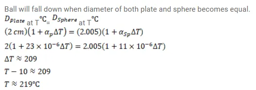 An aluminium plate fixed in a horizontal position has a hole diameter $2.000 \mathrm{~cm}$. A steel sphere of diameter $2.005 \mathrm{~cm}$ rests on this hole. All the lengths refer to a temperature of $10^{\circ} \mathrm{C} .$ The temperature of the entire system is slowly increased. At what temperature will the fall down? Coefficient of linear expansion of aluminium is $23^{\times 10^{-6}} /{ }^{\circ} \mathrm{C}$ and that of steel is $11^{\times 10^{-6}} /{ }^{\circ} \mathrm{C}$.