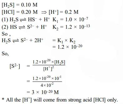 An aqueous solution contains $0.10 \mathrm{M} \mathrm{H}_{2} \mathrm{~S}$ and $0.20 \mathrm{M} \mathrm{HCl}$. If the equilibrium constants for the formation of $\mathrm{HS}^{-}$from $\mathrm{H}_{2} \mathrm{~S}$ is $1.0 \times 10^{-7}$ and that of $\mathrm{S}^{2-}$ from $\mathrm{HS}^{-}$ions is $1.2 \times 10^{-13}$ then the concentration of $S^{2-}$ ions in aqueous solution is :