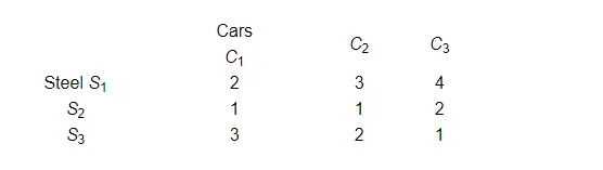 An automobile company uses three types of steel $S_{1}, S_{2}$ and $S_{3}$ for producing three types of cars $C_{1}, C_{2}$ and $C_{3}$. Steel requirements (in tons) for each type of cars are given below