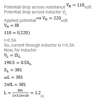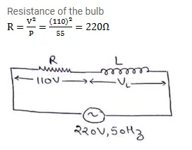 An electric bulb is designed to consume $55 \mathrm{~W}$ when operated at 110 volts. It is connected to a $220 \mathrm{~V}$, $50 \mathrm{~Hz}$ line through a choke coil in series. What should be the coil for which the bulb gets correct voltage?