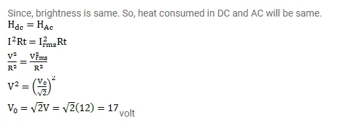 An electric bulb is designed to operate at 12 volts DC. If this bulb is connected to an AC source and gives normal brightness, what would be the peak voltage of the source?