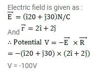Question: An electric field $\left.\overrightarrow{\mathrm{E}}_{=} \overrightarrow{\mathrm{i}}_{20}+\overline{\mathrm{J}}_{30}\right) \mathrm{N} / \mathrm{C}$ exists in the space. If the potential at the origin is taken to be zero, find the potential at