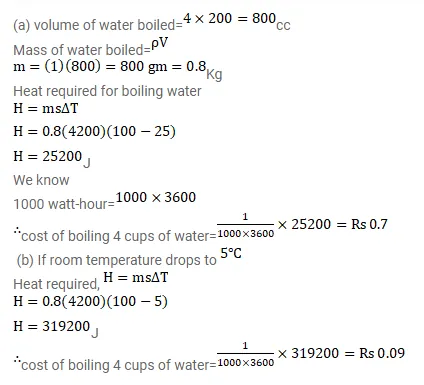 An electric kettle used to prepare tea, takes 2 minutes to boil 4 cups of water ( 1 cup contains 200 cc of water) is the room temperature is $25^{\circ} \mathrm{C}$. (a) If the cost of power consumption is Rs $1.00$ per unit ( 1 unit=1000 watt-hour), calculate the cost of boiling 4 cups of water. (b) What will be the corresponding cost if the room temperature drops to $5^{\circ} \mathrm{C}_{\text {? }}$ ?
