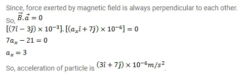 An experiment's diary reads as follows:" a charged particle is projected in a magnetic field of $(7.0 \vec{\imath}-3.0 \vec{\jmath}) \times 10^{-3} \mathrm{~T}$. The acceleration of the particle is found to be $(\vec{\imath}+7.0 \vec{\jmath}) \times 10^{-6} \mathrm{~m} / \mathrm{s}^{2 n}$. The number to the left $\bar{i}_{\text {in }}$ the last expression was not readable. What can this number be?