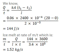 An ice box almost completely filled with ice at $0^{\circ} \mathrm{C}$ is dipped into a large volume of water at $20^{\circ} \mathrm{C}$. The box has walls of surface area $2400 \mathrm{~cm}^{2}$ thickness $2.0 \mathrm{~mm}$ and thermal conductivity $0.06 \mathrm{~W} / \mathrm{m}-{ }^{\circ} \mathrm{C}$ Calculate the rate at which the ice melts in the box. Latent heat of fusion of ice $=3.4 \times 10^{5} \mathrm{~J} / \mathrm{kg}$