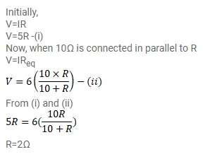 An ideal battery sends a current of $5 \mathrm{~A}$ in a resistor. When another resistor of value $10 \Omega$ is connected in parallel, the current through the battery is increased to $6 \mathrm{~A}$. Find the resistance of the first resistor.