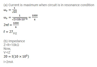 An inductance of $2.0 \mathrm{H}$, a capacitance of $18 \mu \mathrm{F}$ and a resistance of $10 \mathrm{k} \Omega$ are connected to an Ac source of $20 \mathrm{~V}$ with adjustable frequency.