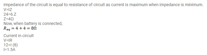 An inductor-coil, a capacitor and an AC source of rms voltage $24 \mathrm{~V}$ are connected in series. When the frequency of the source is varied, a maximum rms current of $6.0 \mathrm{~A}$ is observed. If this inductor coil is connected to a battery of emf $12 \mathrm{~V}$ and the internal resistance $4.0 \Omega$, what will be the current?