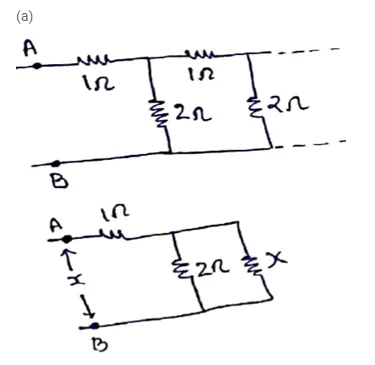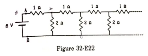 An infinite ladder is constructed with $1 \Omega$ and $2 \Omega$ resistors as shown in figure (32-E22).