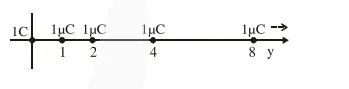 An infinite number of point charges, each carrying $1 \mu \mathrm{C}$ charge, are placed along the $y$-axis at $\mathrm{y}=1 \mathrm{~m}, 2 \mathrm{~m}, 4 \mathrm{~m}, 8 \mathrm{~m}$...............