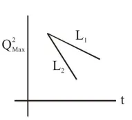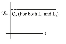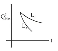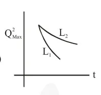 An LCR circuit is equivalent to a damped pendulum. In an LCR circuit the capacitor is charged to $\mathrm{Q}_{0}$ and then connected to the $\mathrm{L}$ and $\mathrm{R}$ as shown below. If a student plots graphs of the square of maximum charge $\left(\mathrm{Q}_{\text {Max }}^{2}\right)$ on the capacitor with time $(\mathrm{t})$ for two different values $\mathrm{L}_{1}$ and $\mathrm{L}_{2}\left(\mathrm{~L}_{1}>\mathrm{L}_{2}\right)$ of $L$ then which of the following represents this graph correctly ? (plots are schematic and not drawn to scale)
