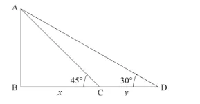Let, $B C=x, C D=y$ and $\angle A D B=30^{\circ}, \angle A C B=45^{\circ}$.