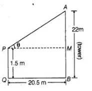 An observer 1.5 m tall is 20.5 m away from a tower 22 m high. Determine the angle of elevation of the top of the tower from the eye of the observer.