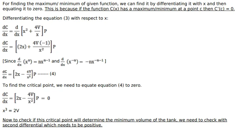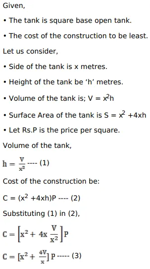 An open tank with a square base and vertical sides is to be constructed from a metal sheet so as to hold a given quantity of water. Show that the cost of the material will be least when the depth of the tank is half of its width.