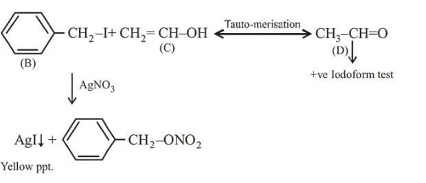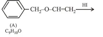 An organic compound ' $\mathrm{A}$ ' $\left(\mathrm{C}_{9} \mathrm{H}_{10} \mathrm{O}\right)$ when treated with conc. HI undergoes cleavage to yield compounds ' $\mathrm{B}$ ' and ' $\mathrm{C}$ '. ' $\mathrm{B}$ ' gives yellow precipitate with $\mathrm{AgNO}_{3}$ where as ' $\mathrm{C}$ 'tautomerizes to 'D'. 'D' gives positive iodoform test. 'A' could be :