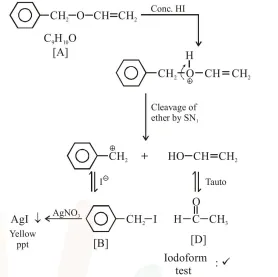 An organic compound ' $\mathrm{A}^{\prime}\left(\mathrm{C}_{9} \mathrm{H}_{10} \mathrm{O}\right)$ when treated with conc. HI undergoes cleavage