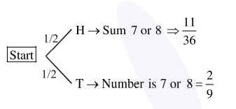 An unbiased coin is tossed. If the outcome is a head then a pair of unbiased dice is rolled and the sum of the numbers obtained on them is noted. If the toss of the coin results in tail then a card from a well-shuffled pack of nine cards numbered $1,2,3, \ldots, 9$ is randomly picked and the number on the card is noted. The probability that the noted number is either 7 or 8 is :