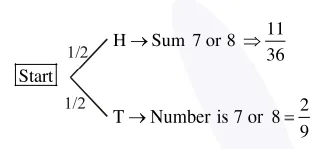 An unbiased coin is tossed. If the outcome is a head then a pair of unbiased dice is rolled and the sum of the numbers obtained on them is noted. If the toss of the coin results in tail then a card from a well-shuffled pack of nine cards numbered $1,2,3, \ldots, 9$ is randomly picked and the number on the card is noted. The probability that the noted number is either 7 or 8 is :