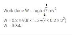 An unruly demonstrator lifts a stone of mass $200 \mathrm{~g}$ from the ground and throws it at his opponent. At the time of projection, the stone is $150 \mathrm{~cm}$ above the ground and has a speed of $3.00 \mathrm{~m} / \mathrm{s}$. Calculate the work done by the demonstrator during the process. If it takes one second for the demonstrator to lift the stone and throw, what horsepower does he use?