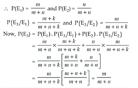An urn contains m white and n black balls. A ball is drawn at random and is put back into the urn along with k additional balls of the same colour as that of the ball drawn. A ball is again drawn at random. Show that the probability of drawing a white ball now does not depend on k.