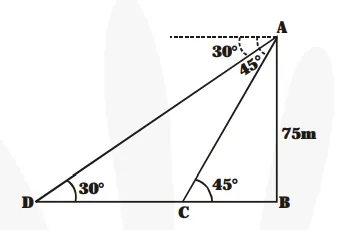 $\therefore \quad \mathrm{AB}=75 \mathrm{~m}$Let the two ships be C and D such that angle of depression from A are $45^{\circ}$ and $30^{\circ}$ respectively.