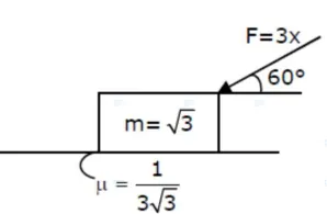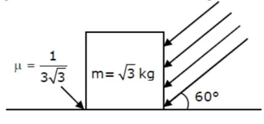 As shown in the figure, a block of mass $\sqrt{3} \mathrm{~kg}$ is kept on a horizontal rough surface of coefficient of friction $\frac{1}{3 \sqrt{3}}$. The critical force to be applied on the vertical surface as shown at an angle $60^{\circ}$ with horizontal such that it does not move, will be $3 \mathrm{x}$. The value of $\mathrm{x}$ will be