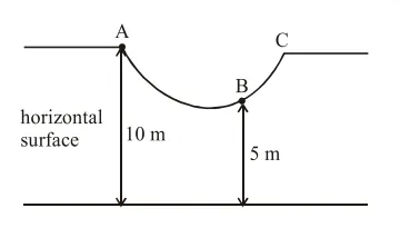 As shown in the figure, a particle of mass 10 $\mathrm{kg}$ is placed at a point A. When the particle is slightly displaced to its right, it starts moving and reaches the point $B$. The speed of the particle at $\mathrm{B}$ is $\times \mathrm{m} / \mathrm{s}$. (Take $\mathrm{g}=10 \mathrm{~m} / \mathrm{s}^{2}$ )