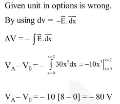Assume that an electric field $\overrightarrow{\mathrm{E}}=30 \mathrm{x}^{2} \hat{\mathrm{i}}$ exists in space. Then the potential difference $\mathrm{V}_{\mathrm{A}}-\mathrm{V}_{\mathrm{O}}$, where $\mathrm{V}_{\mathrm{O}}$ is the potential at the origin and $\mathrm{V}_{\mathrm{A}}$ the potential at $\mathrm{x}=2 \mathrm{~m}$ is :-