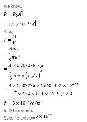 Assume that the mass of a nucleus is approximately given by $\mathrm{M}=\mathrm{Am} \mathrm{p}_{\mathrm{p}}$ where $\mathrm{A}$ is the mass number. Estimate the density of matter in $\mathrm{kg} / \mathrm{m}^{3}$ inside a nucleus. What is the specific gravity of nuclear matter?