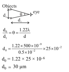 Assuming human pupil to have a radius of $0.25 \mathrm{~cm}$ and a comfortable viewing distance of $25 \mathrm{~cm}$, the minimum separation between two objects that human eye can resolve at $500 \mathrm{~nm}$ wavelength is:-