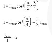 At two points $\mathrm{P}$ and $\mathrm{Q}$ on screen in Young's double slit experiment, waves from slits $\mathrm{S}_{1}$ and $\mathrm{S}_{2}$ have a path difference of 0 and $\frac{\lambda}{4}$ respectively. the ratio of intensities at $P$ and $Q$ will be :