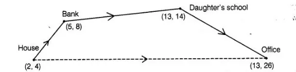 house is situated at (2, 4), bank at (5, 8), school at (13,14) and office at (13, 26) and coordinates are in km.