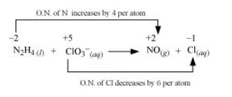 On multiplying $\mathrm{N}_{2} \mathrm{H}_{4}$ with 3 and $\mathrm{ClO}_{3}^{-}$with 4 to balance the increase and decrease in $\mathrm{O} . \mathrm{N}$., we get: