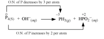 $5 \mathrm{P}_{4}(\mathrm{~s})+12 \mathrm{OH}^{-} \rightarrow 8 \mathrm{PH}_{3}(\mathrm{~g})+12 \mathrm{HPO}_{2}^{-}$