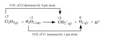 The oxidation number of $\mathrm{Cl}$ decreases from $+7$ in $\mathrm{Cl}_{2} \mathrm{O}_{7}$ to $+3$ in $\mathrm{ClO}_{2}^{-}$and the oxidation number of $\mathrm{O}$ increases from $-1$ in $\mathrm{H}_{2} \mathrm{O}_{2}$ to zero in $\mathrm{O}_{2}$. Hence, in this