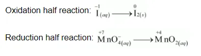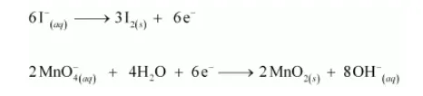 (a) $\mathrm{MnO}_{4}^{-}$(aq) $+\mathrm{I}^{-}$(aq) $\rightarrow \mathrm{MnO}_{2}$ (s) $+\mathrm{I}_{2}$ (s) (in basic medium)