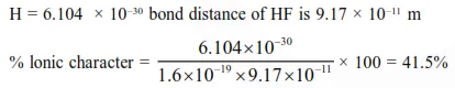 Question: Bond distance in HF is $9.17 \times 10^{-11} \mathrm{~m}$. Dipole moment of $\mathrm{HF}$ is $6.104 \times 10^{-30} \mathrm{Cm}$. The percent ionic character in HF will be : (electron charge $=1.60 \times 10^{-19} \mathrm{C}$ )