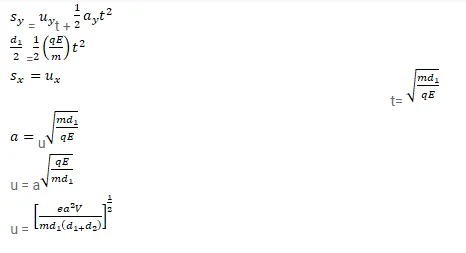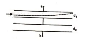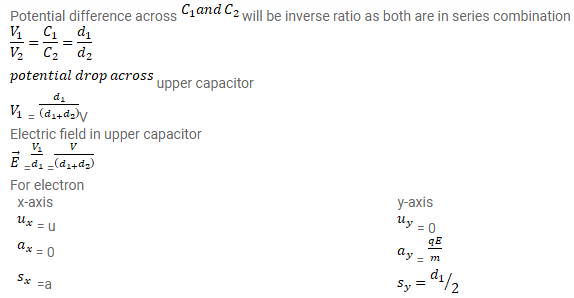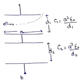 Both the capacitors shown in figure are made of square plates of edges a. The separations between the plates of the capacitors are $d_{1}$ and $d_{2}$ as shown in the figure. A potential difference $V$ is applied between the point a and $b$. An electron is projected between the plates of the upper capacitor along the central line. With what minimum speed should the electron be projected so that it does not collide with any plate? Consider only the electric forces.