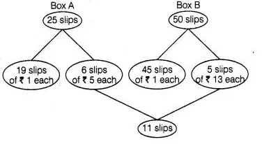 Box A contains 25 slips of which 19 are marked ₹ 1 and other are marked ₹ 5 each. Box B contains 50 slips of which 45 are marked ₹ 1 each and
