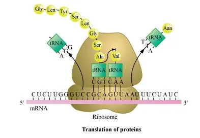 During the initiation of the translation, tRNA gets charged when the amino acid binds to it using ATP. The start (initiation) codon (AUG) present on mRNA is recognized only by the charged tRNA. The ribosome acts as an actual site for the process of translation and contains two separate sites in a large subunit for the attachment of subsequent amino acids. The small subunit of ribosome binds to mRNA at the initiation codon (AUG) followed by the large subunit. Then, it initiates the process of translation. During the elongation process, the ribosome moves one codon downstream along with mRNA so as to leave the space for binding of another charged tRNA. The amino acid brought by tRNA gets linked with the previous amino acid through a peptide bond and this process continues resulting in the formation of a polypeptide chain. When the ribosome reaches one or more STOP codon (VAA, UAG, and UGA), the process of translation gets terminated. The polypeptide chain is released and the ribosomes get detached from mRNA.