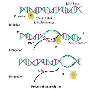The DNA-dependent RNA polymerase and certain initiation factors (σ) bind at the double stranded DNA at the promoter region of the template strand and initiate the process of transcription. RNA polymerase moves along the DNA and leads to the unwinding of DNA duplex into two separate strands. Then, one of the strands, called sense strand, acts as template for mRNA synthesis. The enzyme, RNA polymerase, utilizes nucleoside triphosphates (dNTPs) as raw material and polymerizes them to form mRNA according to the complementary bases present on the template DNA. This process of opening of helix and elongation of polynucleotide chain continues until the enzyme reaches the terminator region. As RNA polymerase reaches the terminator region, the newly synthesized mRNA transcripted along with enzyme is released. Another factor called terminator factor (ρ) is required for the termination of the transcription.