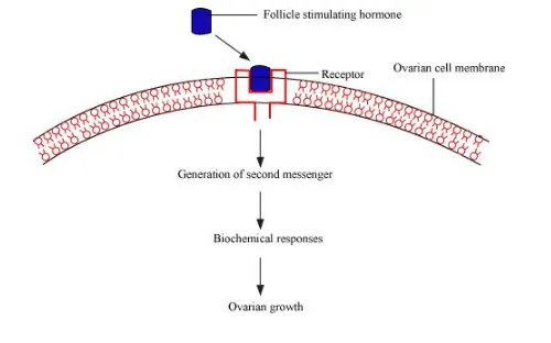 Action of FSH: Follicle stimulating hormone produces its effect by binding to its specific receptors present on the ovarian cell membrane.